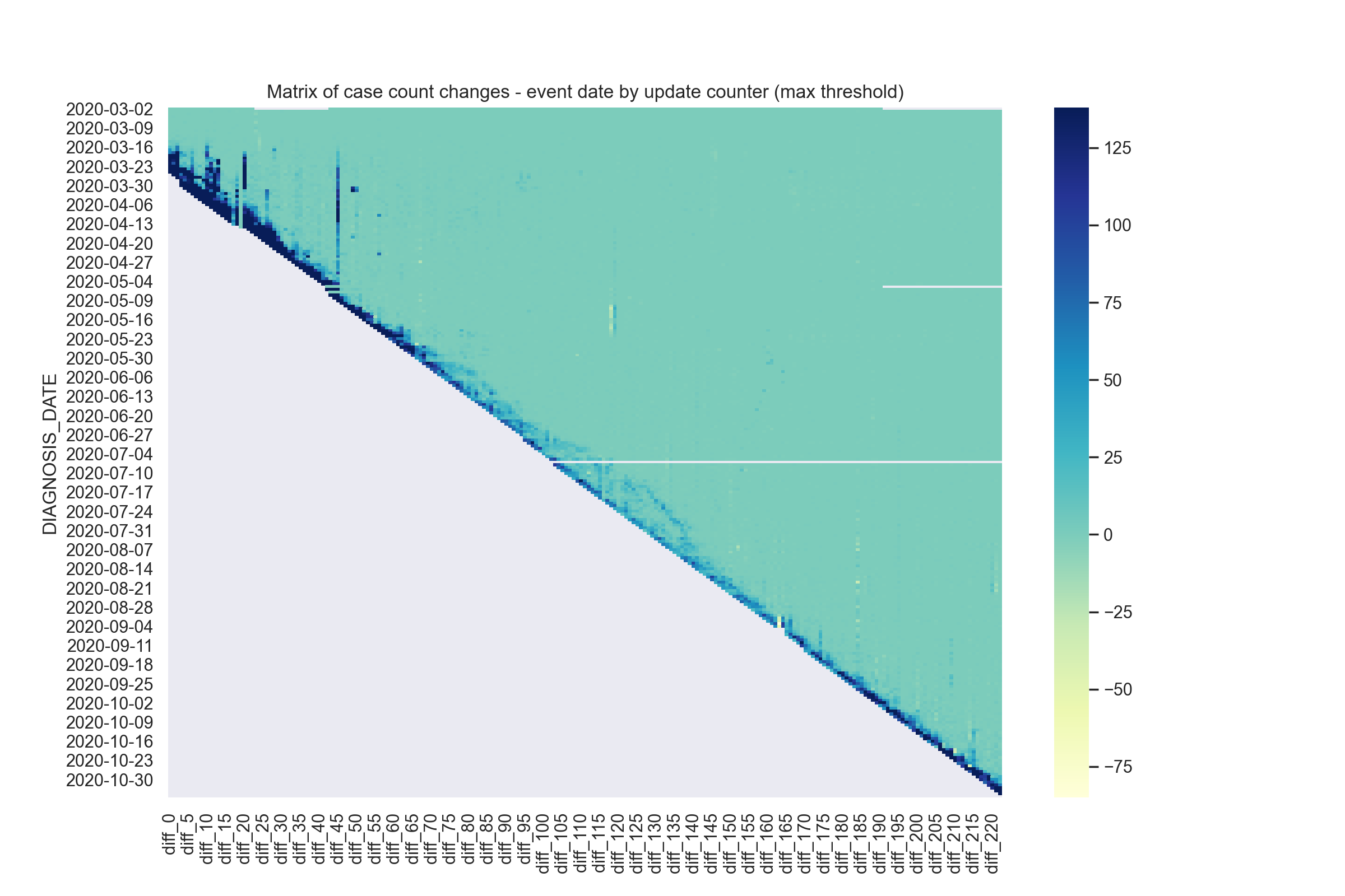 I extracted data from their github repository and downloaded all prior data versions. They changed their folder and data schema a few times, so for this first analysis, I took the easiest route and got around the first six months of data. I did a simple analysis of only the case count and thought about the data in three ways. The first is a matrix showing the case count change after each update by event date. The other two are the cumulative case count changes by event date and update iteration, respectively. So how skewed are the numbers from what they actually tallied up towards? And going into the fall, was the tallying closer to what the numbers actually ended up as?